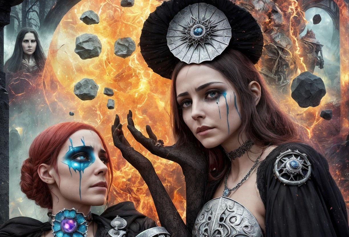 Two women stand in front of a mystical forest backdrop, featuring an oversized moon. One has striking blue makeup, while both are adorned with dark, elegant attire, flanked by owls.