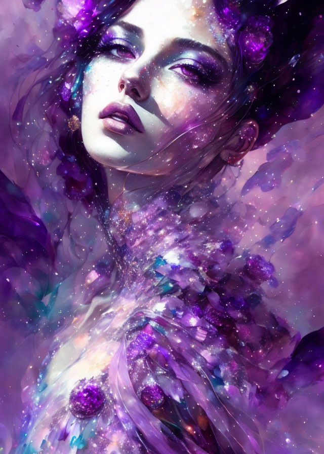 illustration of a young woman wearing a sparkling dress made of purple crystals, intricate, colourful, sensual, art by artem demura, agnes Cecile, Conrad roset, ink, watercolor