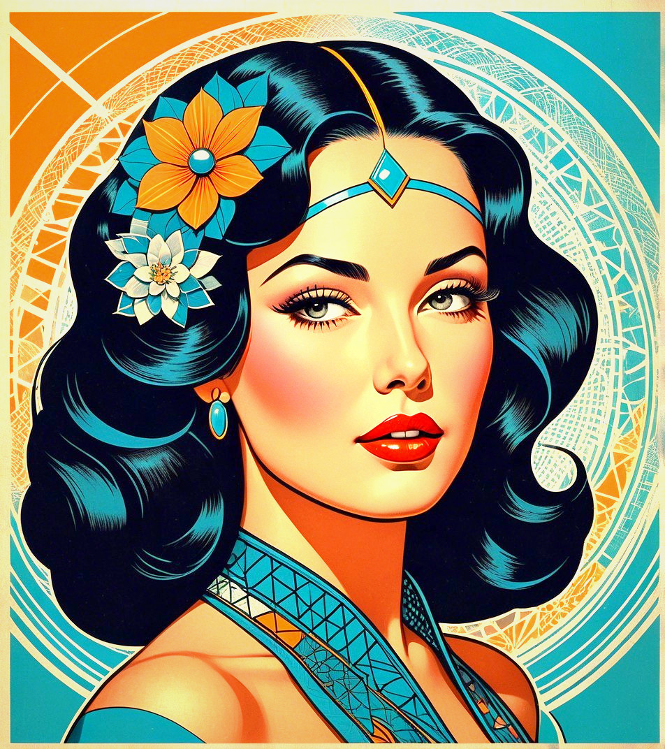 The image features a stylized portrait of a captivating woman with rich, wavy hair adorned with flowers. She wears a blue headband and intricate jewelry, set against a vibrant, geometric background.