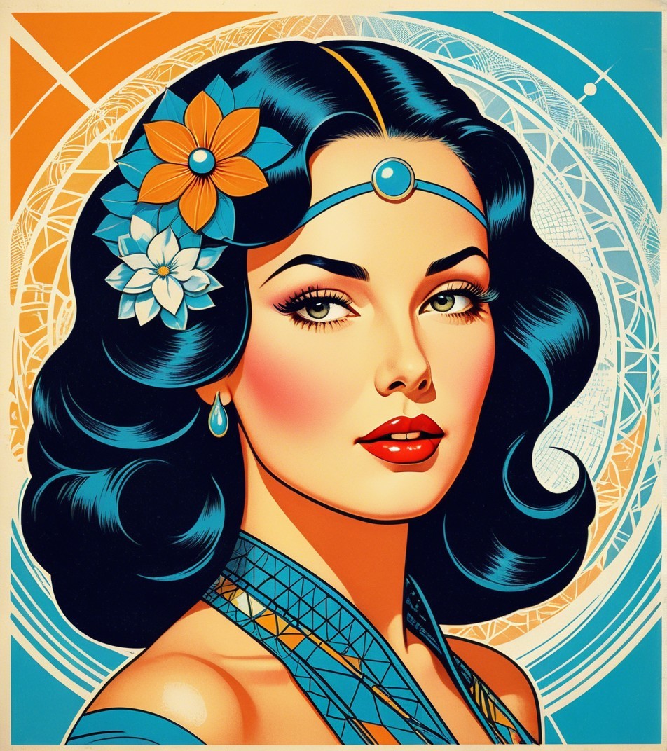 + Prompt:Geometric portrait with lineage and line-art fusion, retro psychedelic, 1950s space age style, comic book art and scratchbook art blend, enchanting lineage illustration featuring a temptress portrayed with a lavish expression. The artwork is a woodblock print characterized by abstract coherence and only curves in zentangle style fractalisation, stylization, highly detailed, tessellated design with a stylized lineage illustration. The piece incorporates gouache details reminiscent of Ho Baron's style, with a gothical twist and 3D effects for hairstyle, stylized linocut by Earl Moran and Man Ray. Hues by Georgia O'Keeffe. Triadic color scheme deep-blue yellow-beige dark-ochre, surrealism by Gayane Khachaturian, warm yellow pastel color palette. symmetrical, lineage details, plasticity 1.3, flat image, plain strokes. Enchanting Woodblock Print by Earl Moran. Hues by Georgia O'Keeffe, intricate coloring, very smooth complexion, retrofuturistic elements, 128k rendering, cel-shaded drawing style, novelty architecture, dof, bokeh, debeh, negative lucas numbers, iridescent, Infuse elements from the styles of Naoto Hattori, Renny Tait, and William Turner, detailed line-art with geometrical precision: