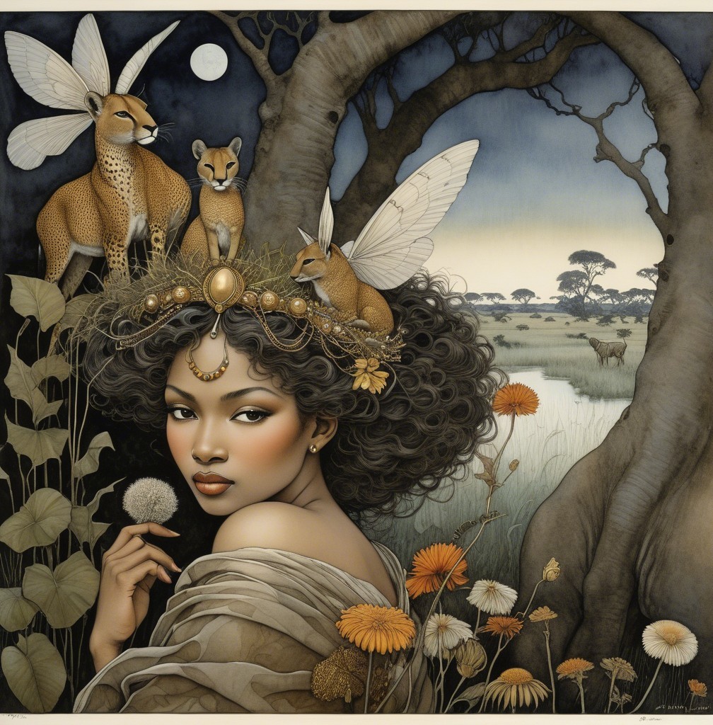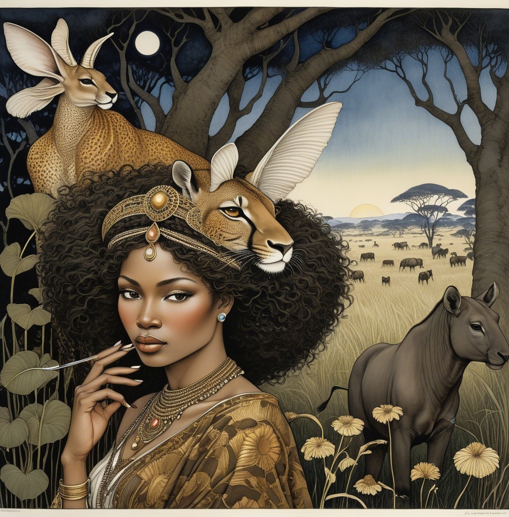 A serene scene features a woman with long, curly hair in ornate attire, surrounded by majestic wildlife like elephants, lions, and antelope against a moonlit savanna backdrop.