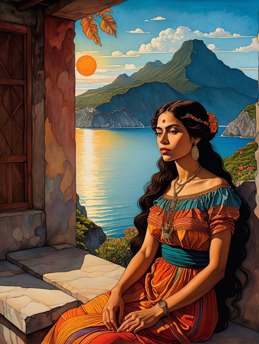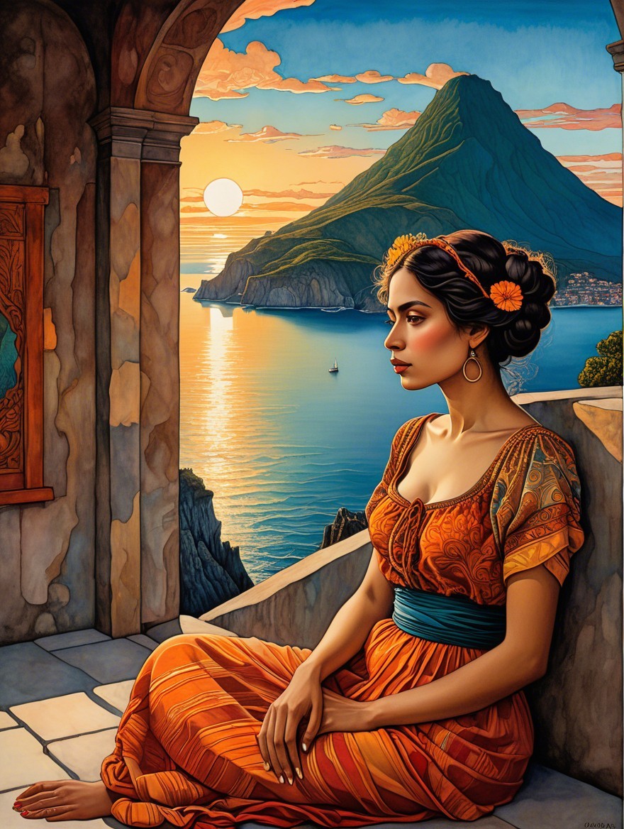 Woman in patterned dress gazes at sunset over sea
