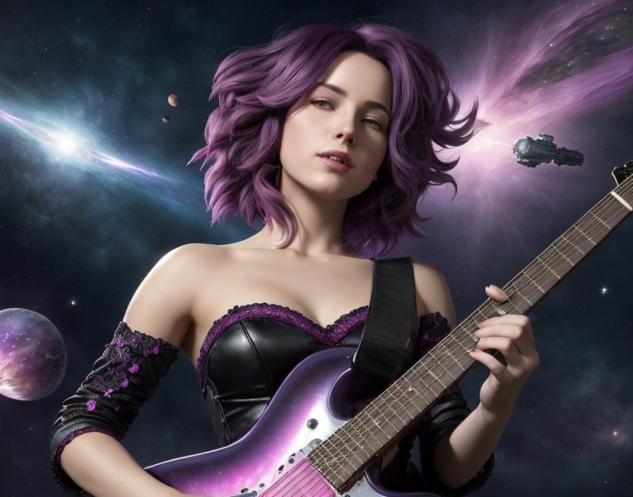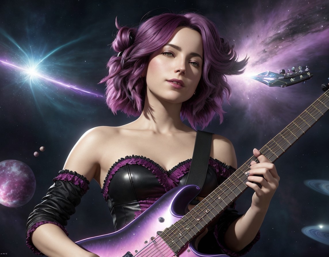 Prompt: "A portrait figure of a woman with wild magenta colored hair playing a rock style guitar and in the background her playing notes are seen blooming in the air against a galaxy of planets and particles flying around, detailed fantasy background, extremely detailed; by Kim Kieber Antoine Collignon and Adam Cashin Tim Burton Peter Morbacher, Realism; The composition is amazing; dynamic lighting; Carefully composed concept art, fascinating_stars, masterpiece, mystical fog, digital illustration, reflections, cell shadow, magical_volume_lighting, picturesque, mighty, grand, detailed, magnificent, mysterious, wondrous, misty, dark, colorful, complex"