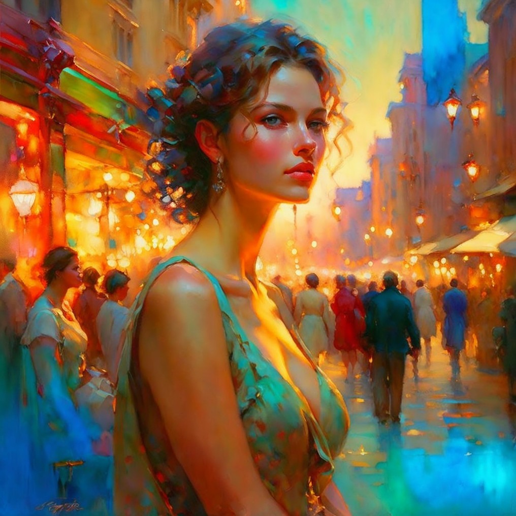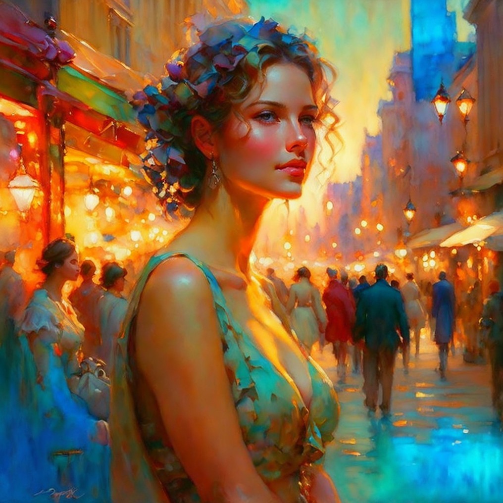 An illustrated woman with a floral crown in a bustling, warmly lit evening street scene.