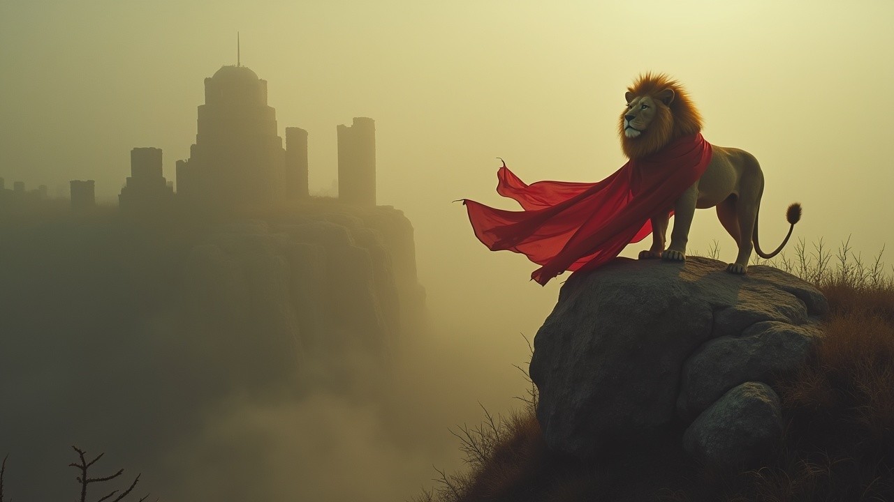 A majestic lion stands atop a rocky outcrop, draped in a flowing red cape. Behind it is a misty landscape with ancient ruins, evoking a sense of strength and timeless nobility.