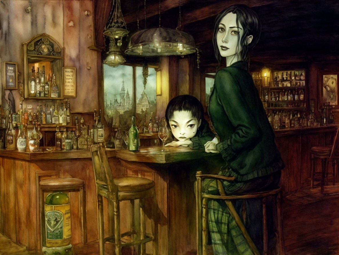 Illustration of boy and woman in dimly lit vintage bar with cityscape view.