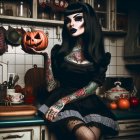 A woman with dark hair and striking makeup sits in a rustic kitchen, holding a carved pumpkin. She wears a gothic dress adorned with roses, exuding a Halloween vibe.