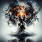 A mystical figure emerges from shimmering water, with flowing hair resembling flames and waves. Ethereal light surrounds her, creating an enchanting atmosphere of beauty and magic.