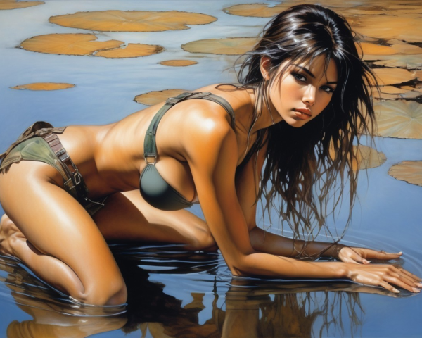 A woman in a bikini kneels by a tranquil water source, reflecting natural beauty. Her tanned skin glistens as she interacts with the serene surroundings, evoking a sense of connection with nature.