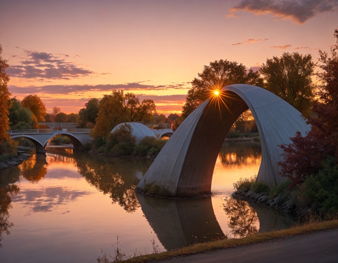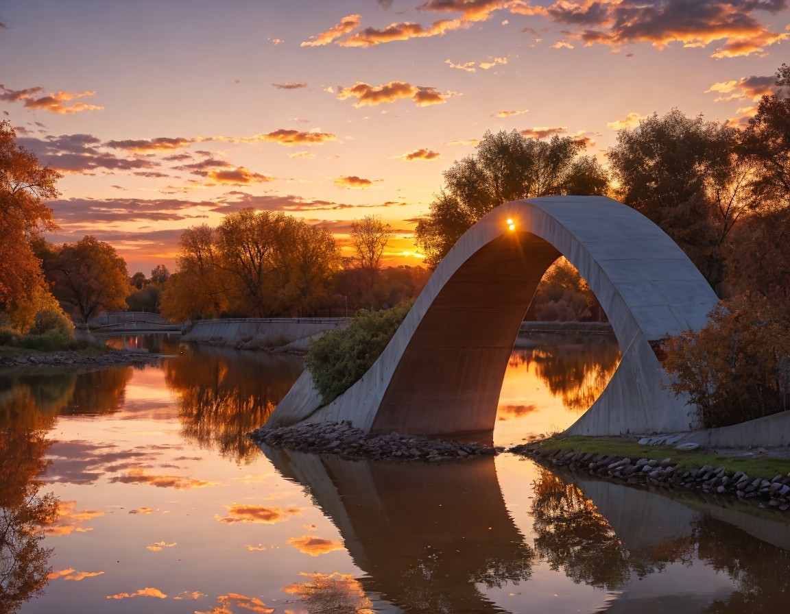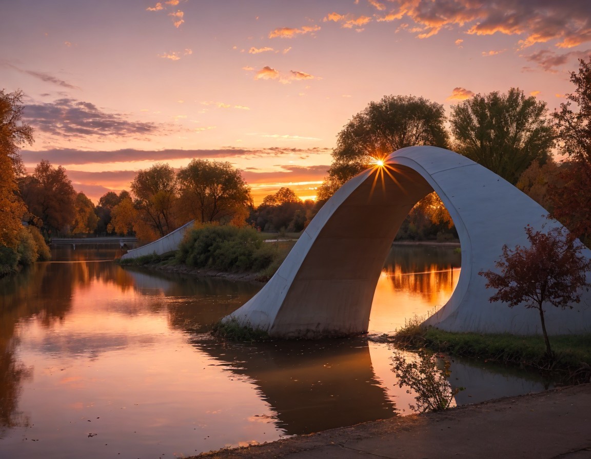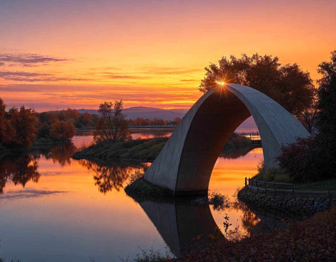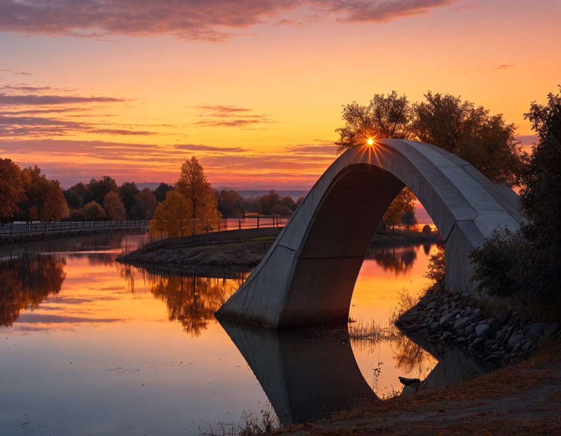 The image showcases a stunning sunset over a serene river, with vibrant orange and yellow skies reflecting on the water. An elegant arch bridge and autumn trees enhance the tranquil scene.