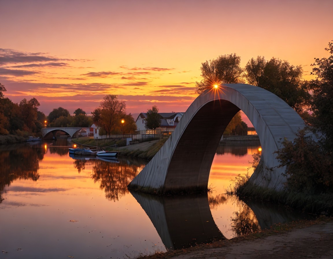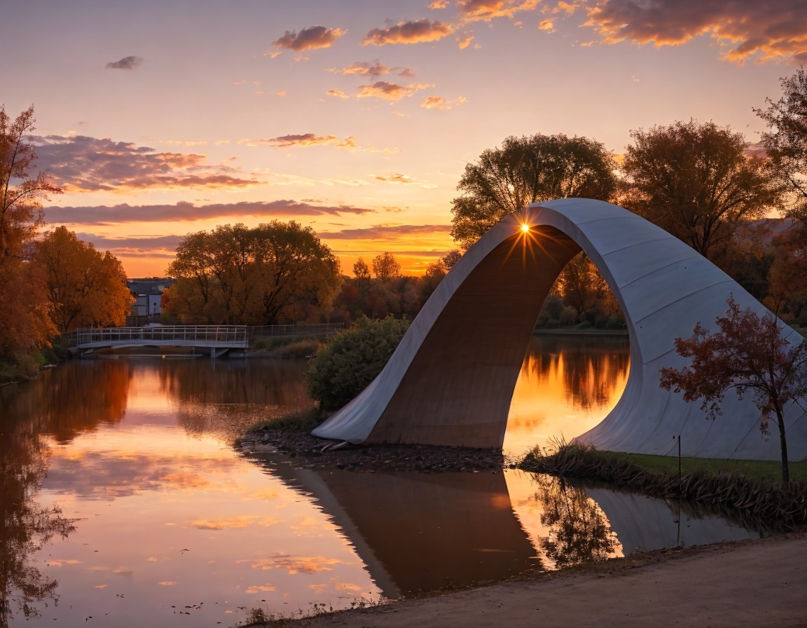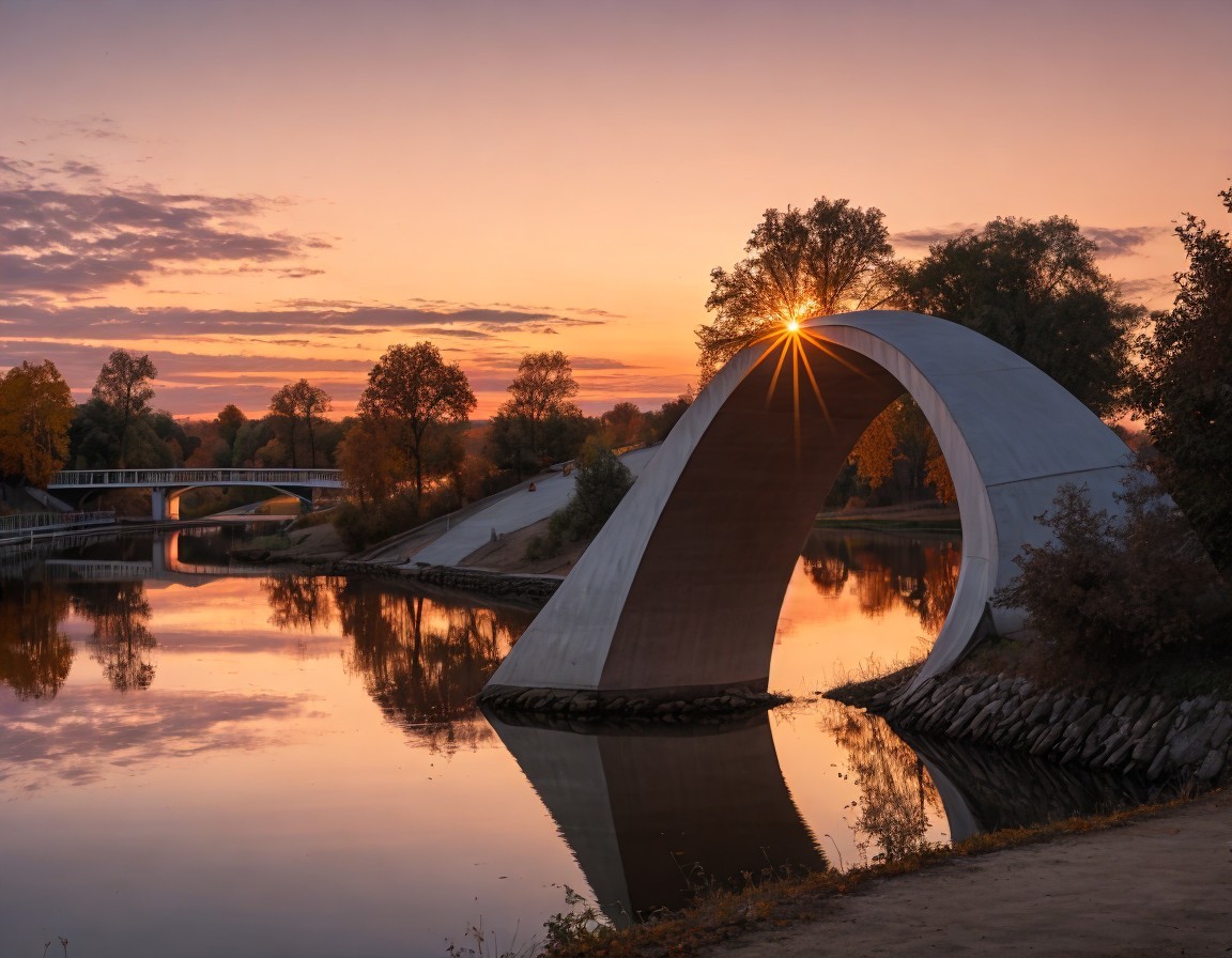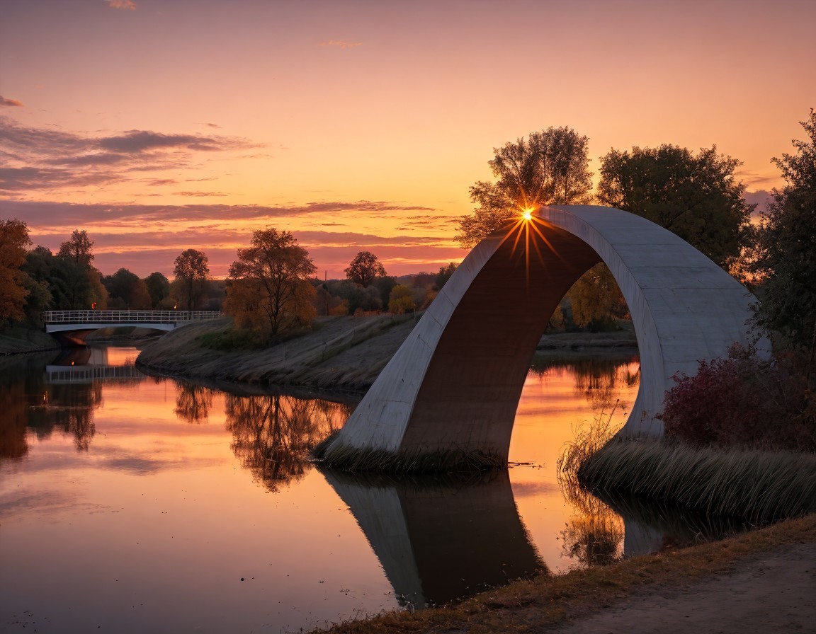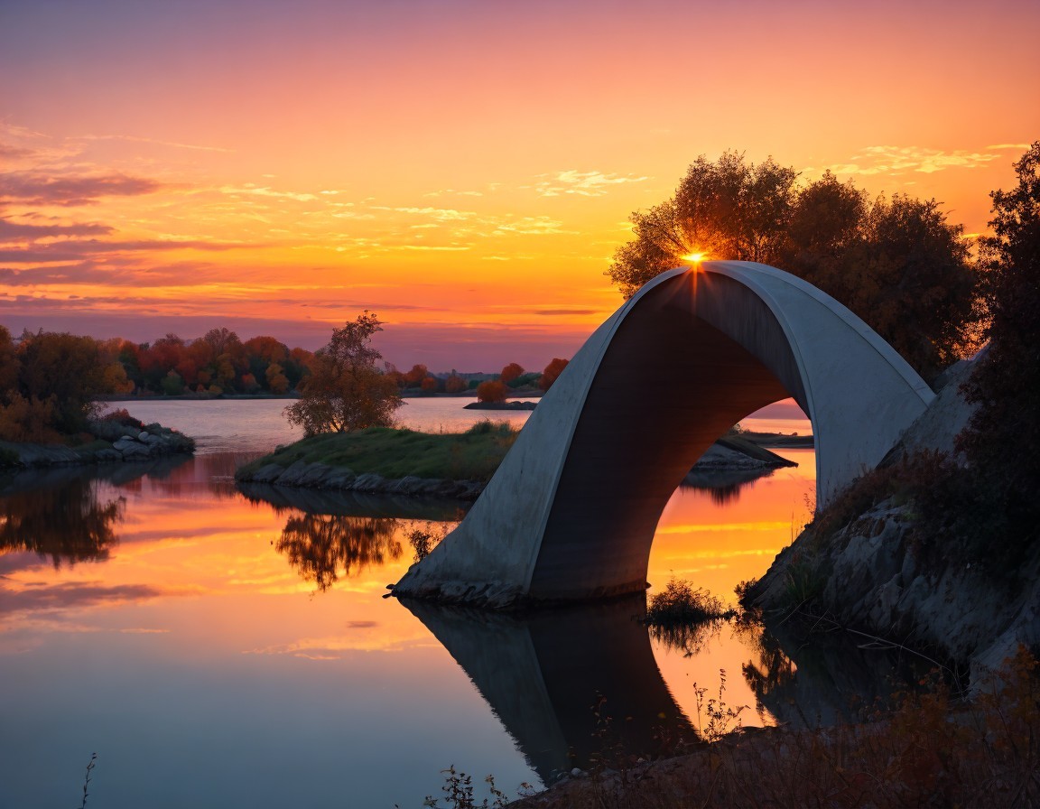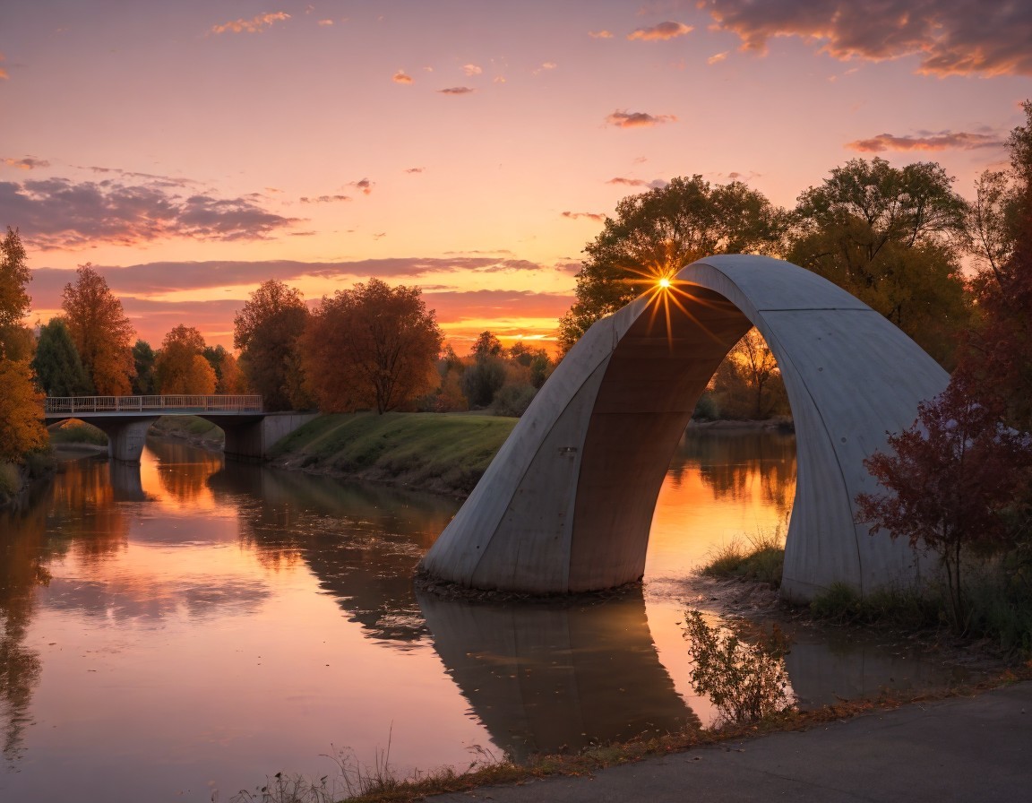 The image showcases a stunning sunset over a serene river, with vibrant orange and yellow skies reflecting on the water. An elegant arch bridge and autumn trees enhance the tranquil scene.