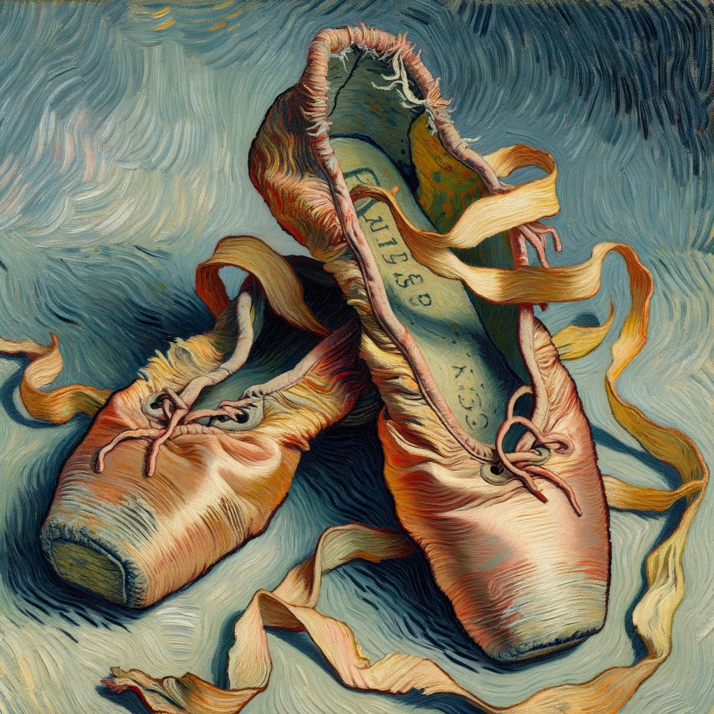 This was begun with AIVision simply because no other style would produce actual pointe shoes. I could get dancing shoes, but not pointe shoes. And AIVision is very good at specific details. But I wanted a more painterly look than AIVision produces (at least in my limited prompt building ability), so I evolved with DigitalDaVinci to increase the tattered look and soften.