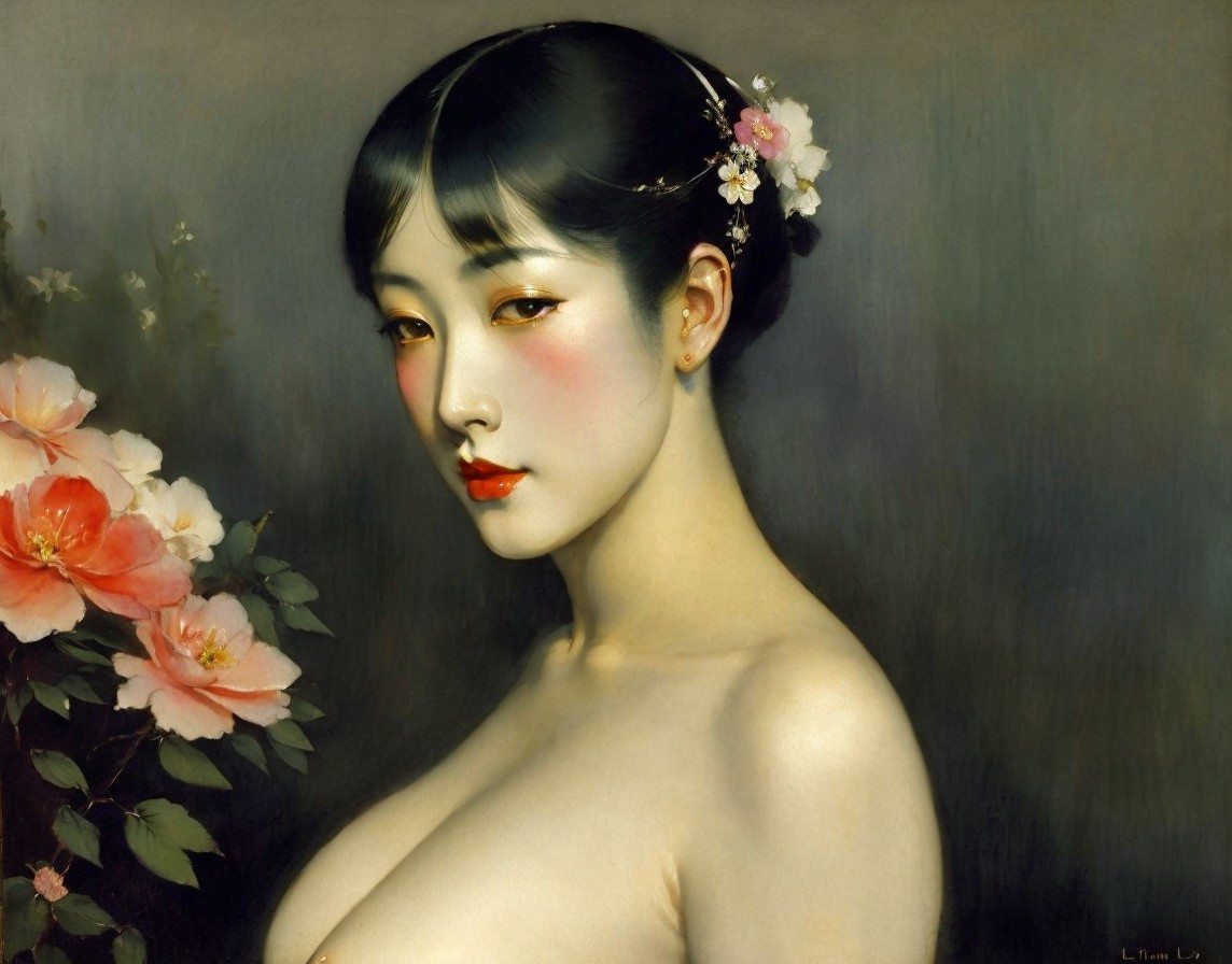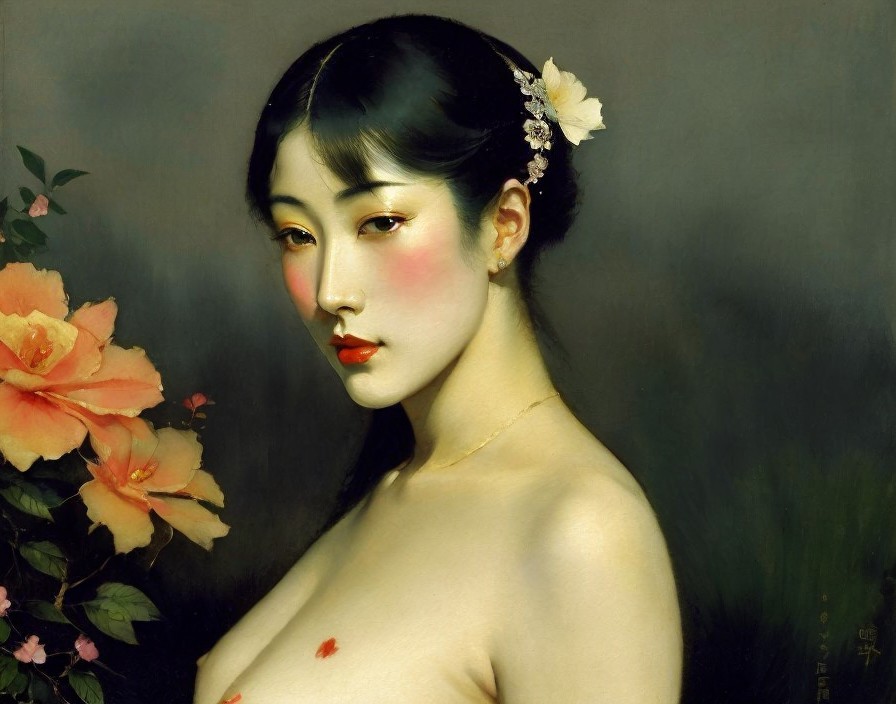 Portrait of young woman with dark hair and flowers, surrounded by roses and foliage