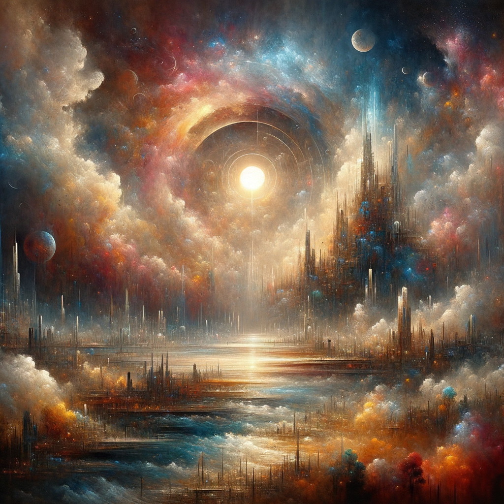 A serene landscape unfolds with two radiant suns above, casting golden light on a tranquil lake. Vibrant autumn trees frame the scene, while a solitary figure gazes into the tranquil waters.