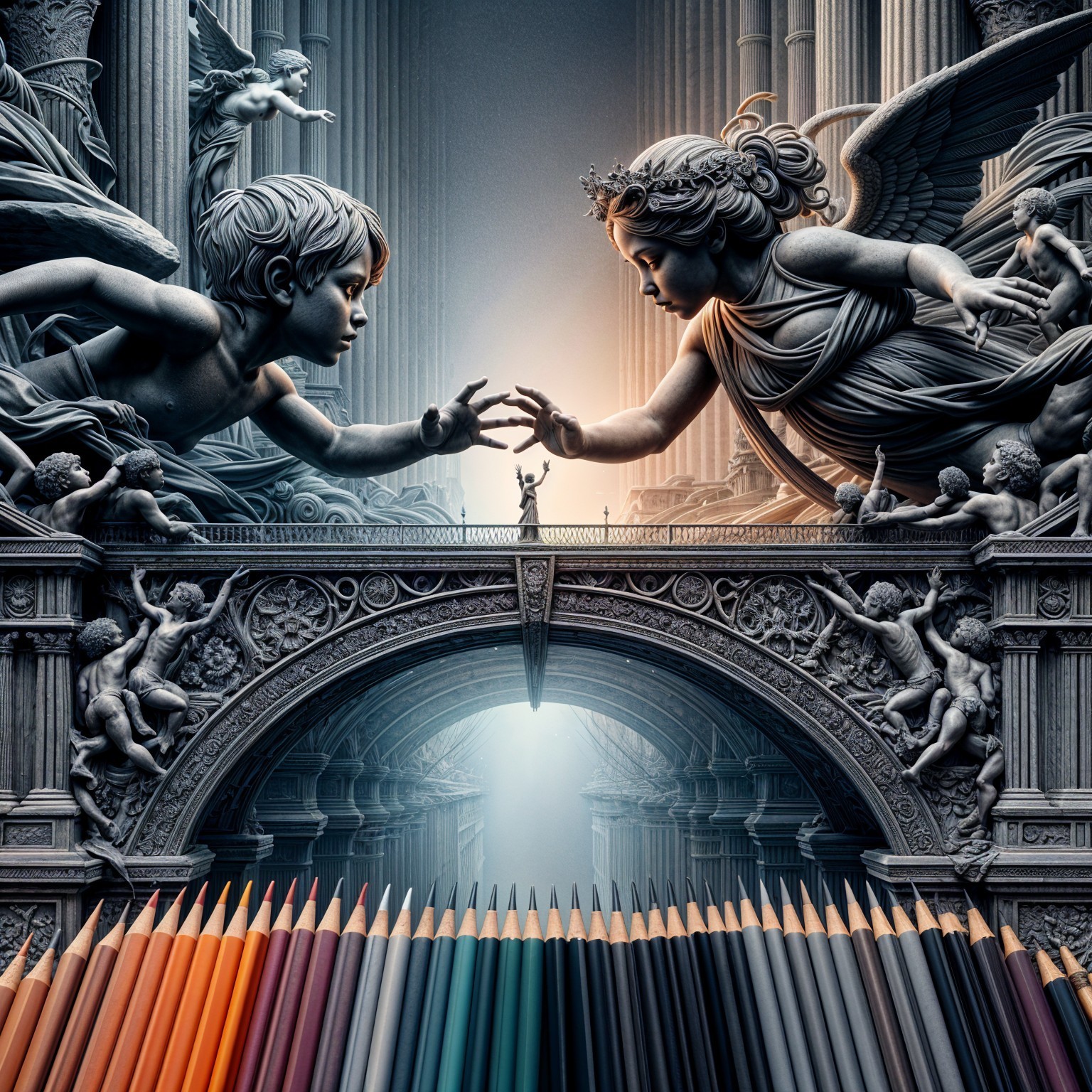 (Try from Mariia) - The image features intricately sculpted angels and children reaching out across a grand archway, with a dramatic light illuminating the scene, complemented by a vibrant array of colored pencils below.