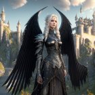 A fierce warrior with majestic black wings stands confidently against a backdrop of a majestic castle. Her armor gleams in the sunlight, blending elegance with strength in a fantastical setting.