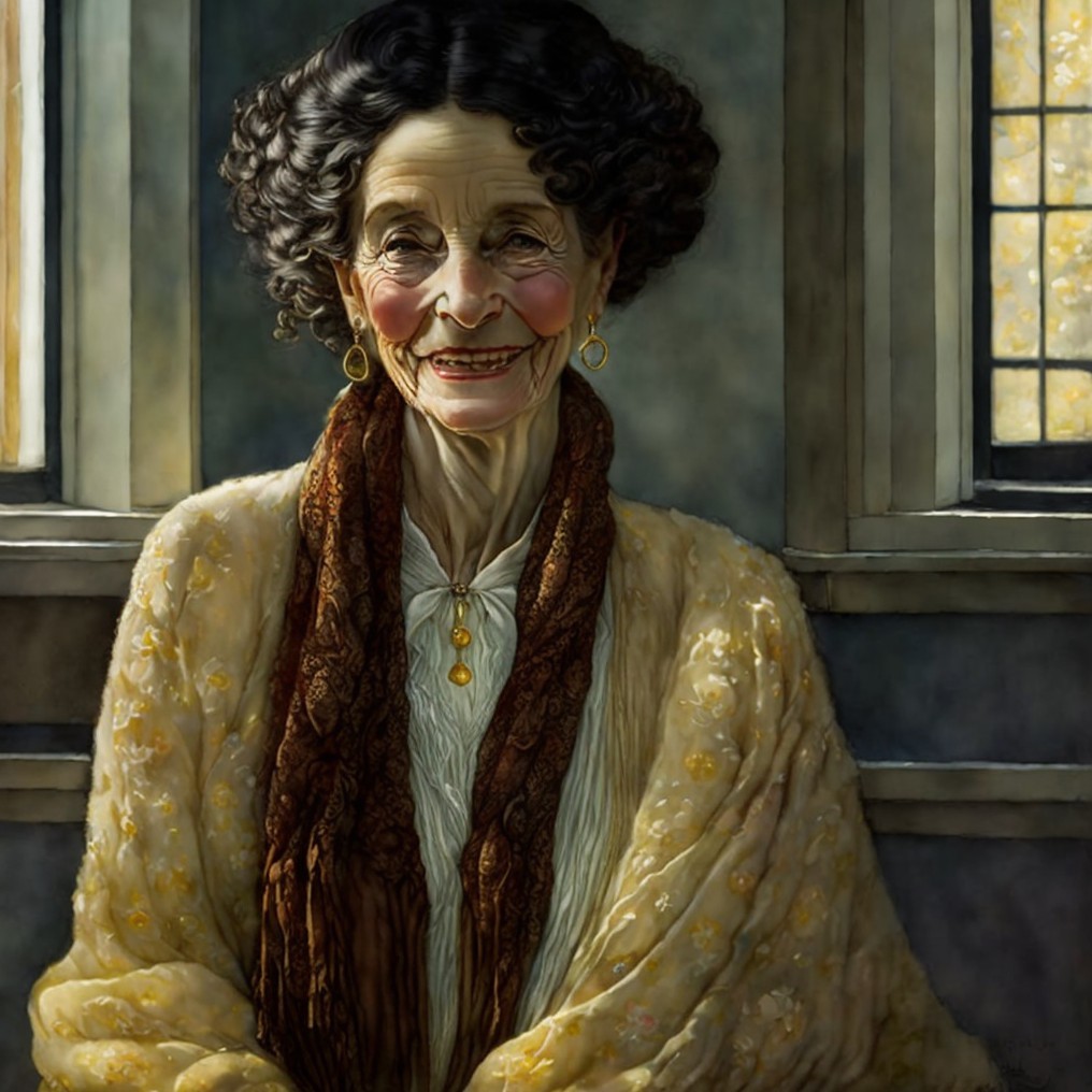 A warm, elderly woman smiles gently, wearing a stylish hat and scarf. She sits by a window, surrounded by soft light and vibrant flowers, exuding a sense of wisdom and kindness.