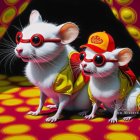 Two stylish mice wearing bright sunglasses and colorful outfits stand against a vibrant, polka-dotted backdrop. Their playful accessories add a fun, whimsical touch to the scene.