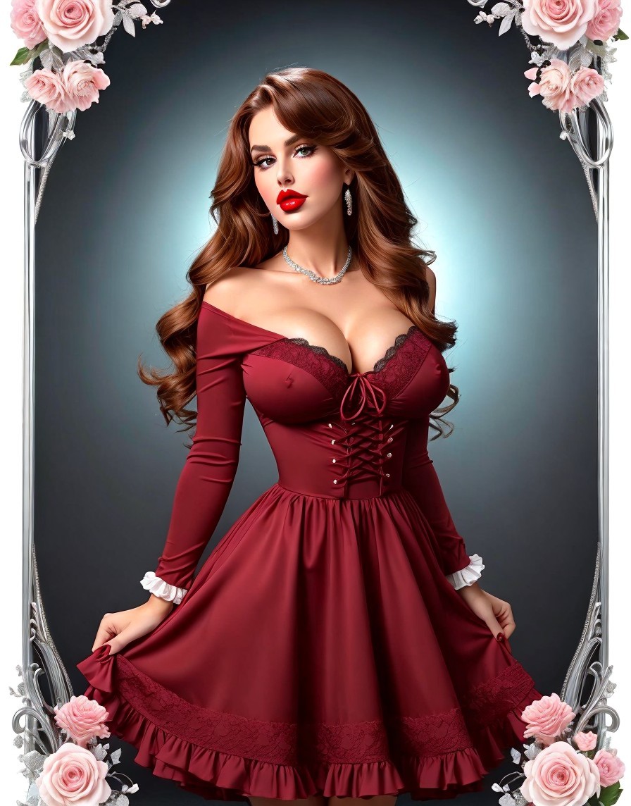 huge breasted, large FFF tits, large cup size GG breasts, ample bosom and a cocksucker face, cocksucking full red lips, whore valley girl. Beautiful face, gorgeous face with a piercing gaze. style of Helmut Newton. Masterpiece. style of Kat Toronto, style of Eric Kroll, style of John Willie, style of Irving Klaw