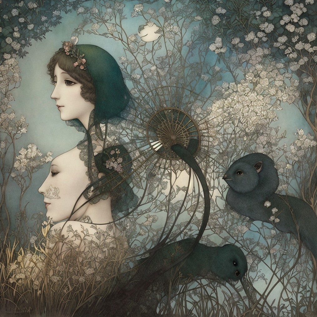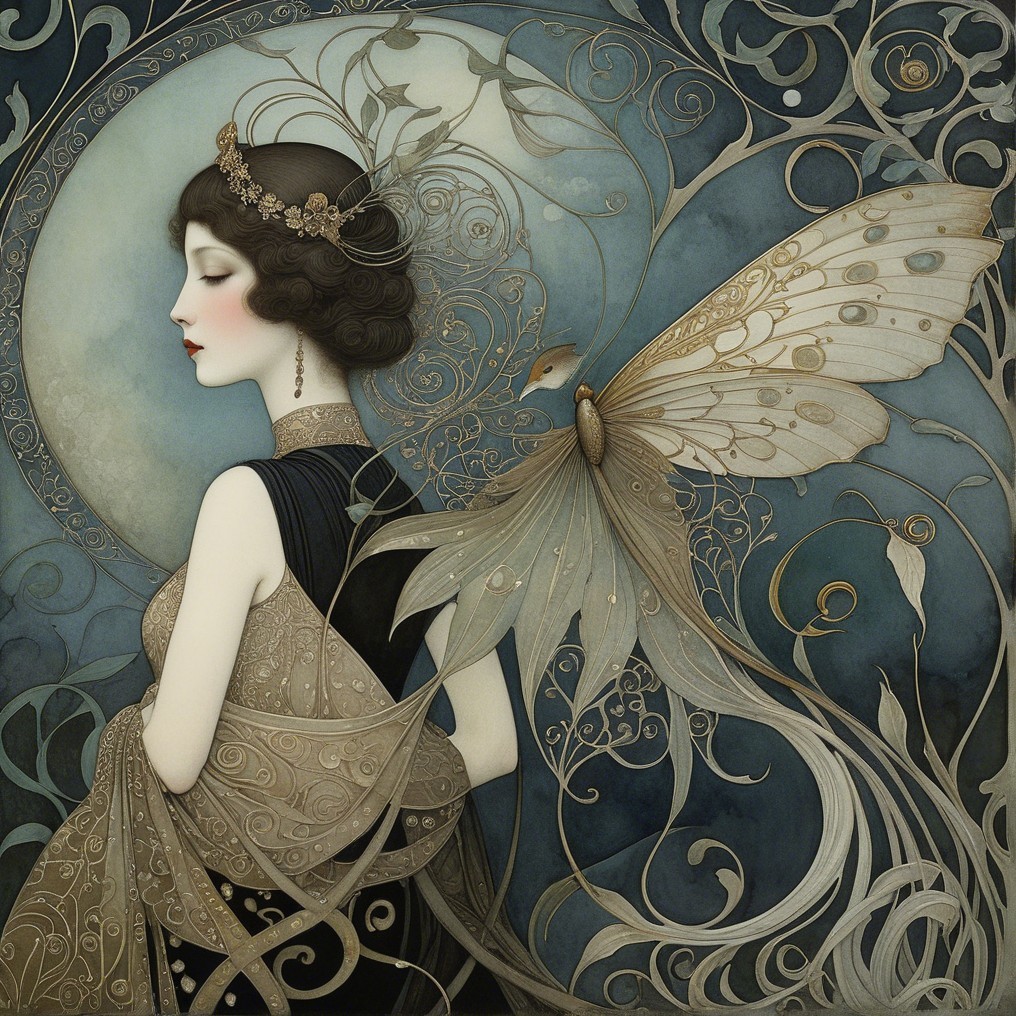 An elegant woman with intricate hair and a stylish fan poses against a rich blue background. Her gown features ornate gold patterns and swirling vines, creating a graceful Art Nouveau aesthetic.