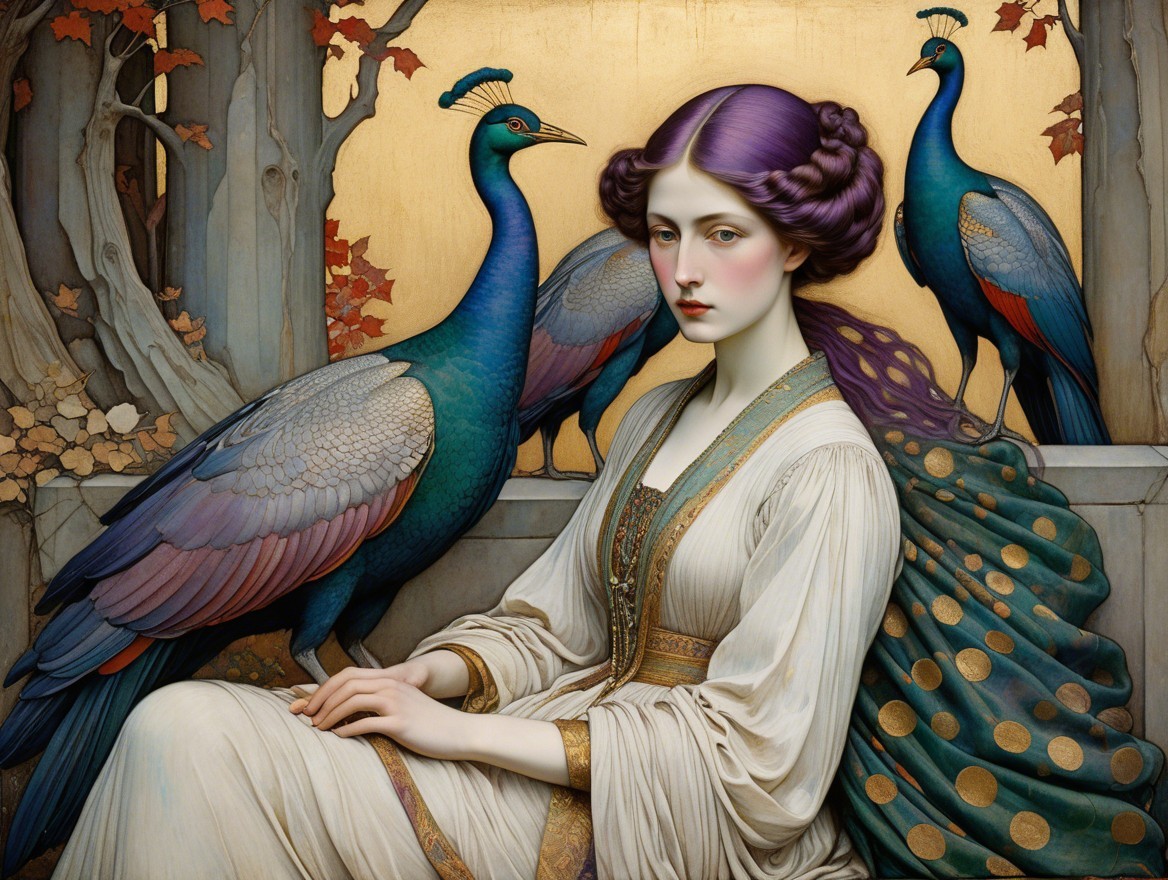 A serene young woman with lavender hair sits elegantly beside two vibrant peacocks, surrounded by ornate artwork and natural elements, exuding a sense of tranquility and beauty.