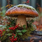 A vibrant orange mushroom with a textured cap grows on a moss-covered log, surrounded by small red berries and lush green foliage, set in a serene forest environment.