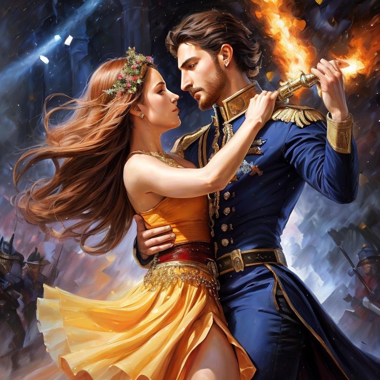 An animated image of a majestic couple dancing, the man in a military uniform and the woman in an orange dress, with a magical, fiery ambiance.