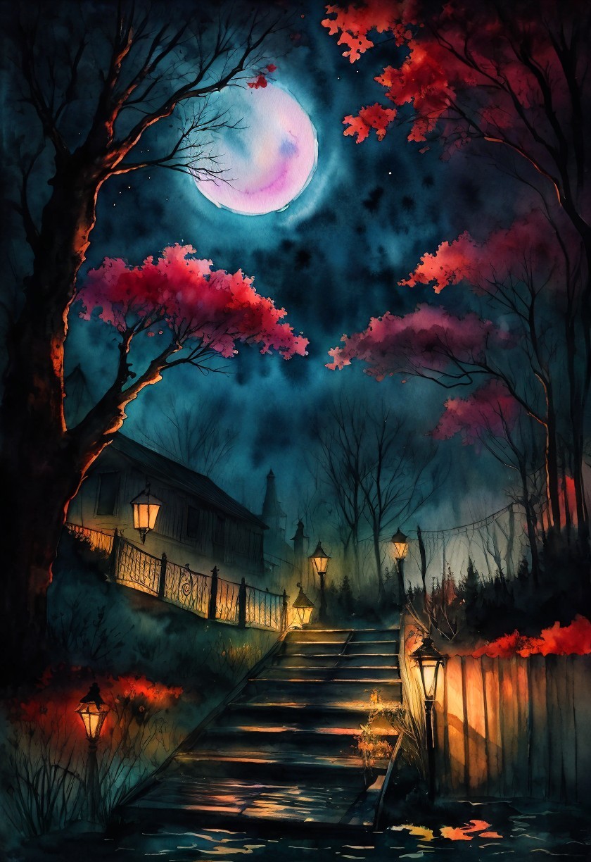 Mystical Night Scene with Full Moon and Cozy House