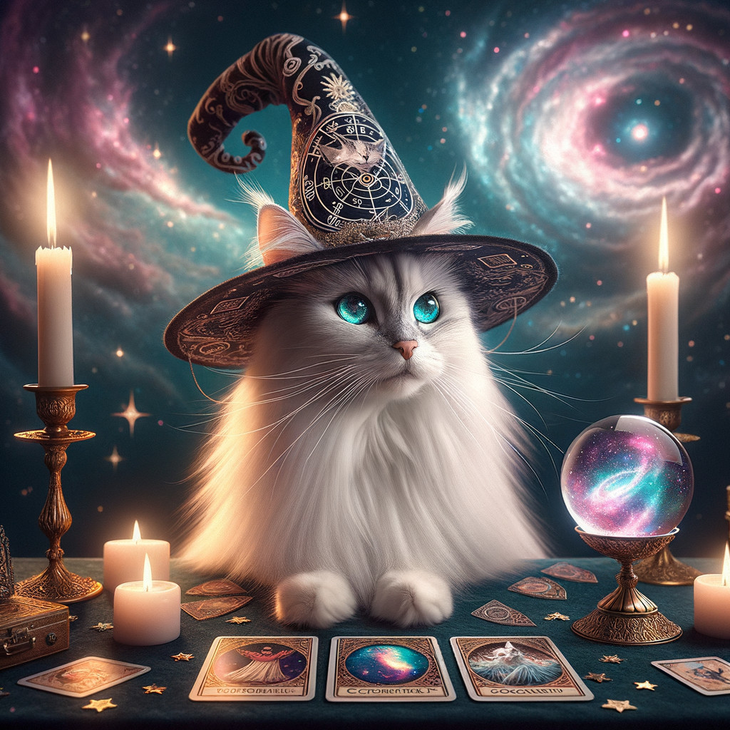 A white fluffy cat with light blue glowing eyes, wearing a black and gold wizard hat, sits on a teal table with tarot cards, lit white candles in ornate gold holders, a gold treasure box, and a cosmic crystal ball on a gold stand. The background shows a celestial, nebula-filled sky