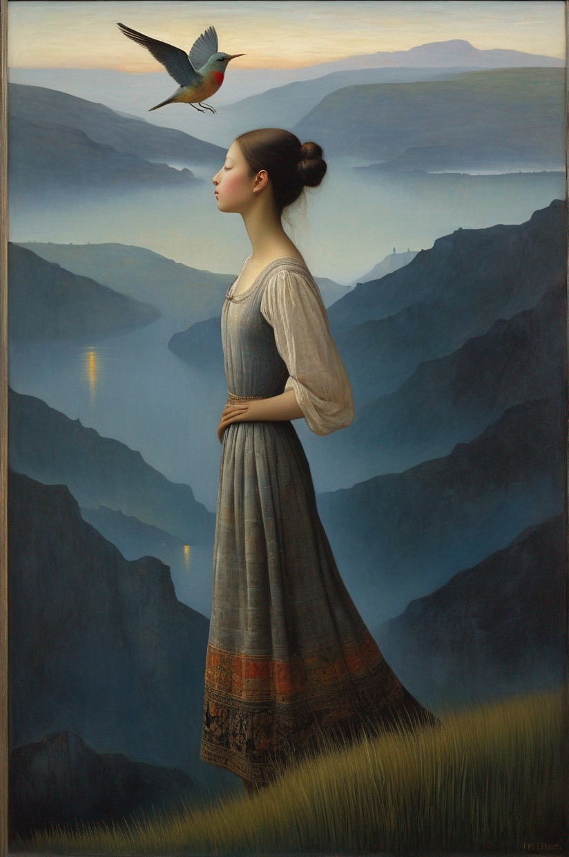 A woman in a flowing dress stands on a cliff at sunset, overlooking a serene lake, accompanied by a white bird, with an artist's signature.