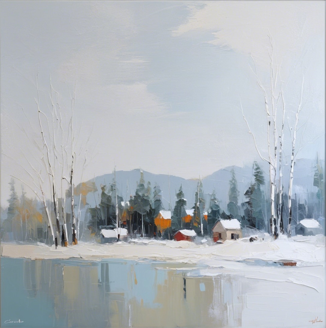 + Prompt:Watching a snowy woodland scene through a glass window. Create an acrylic painting with impasto and visible brush strokes in the style of Carole Rabe, Josef Kote.