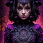 A striking portrait of a woman adorned in intricate, purple-hued attire, featuring floral patterns and elaborate accessories. Her captivating eyes and makeup enhance the mystical, enchanting atmosphere.