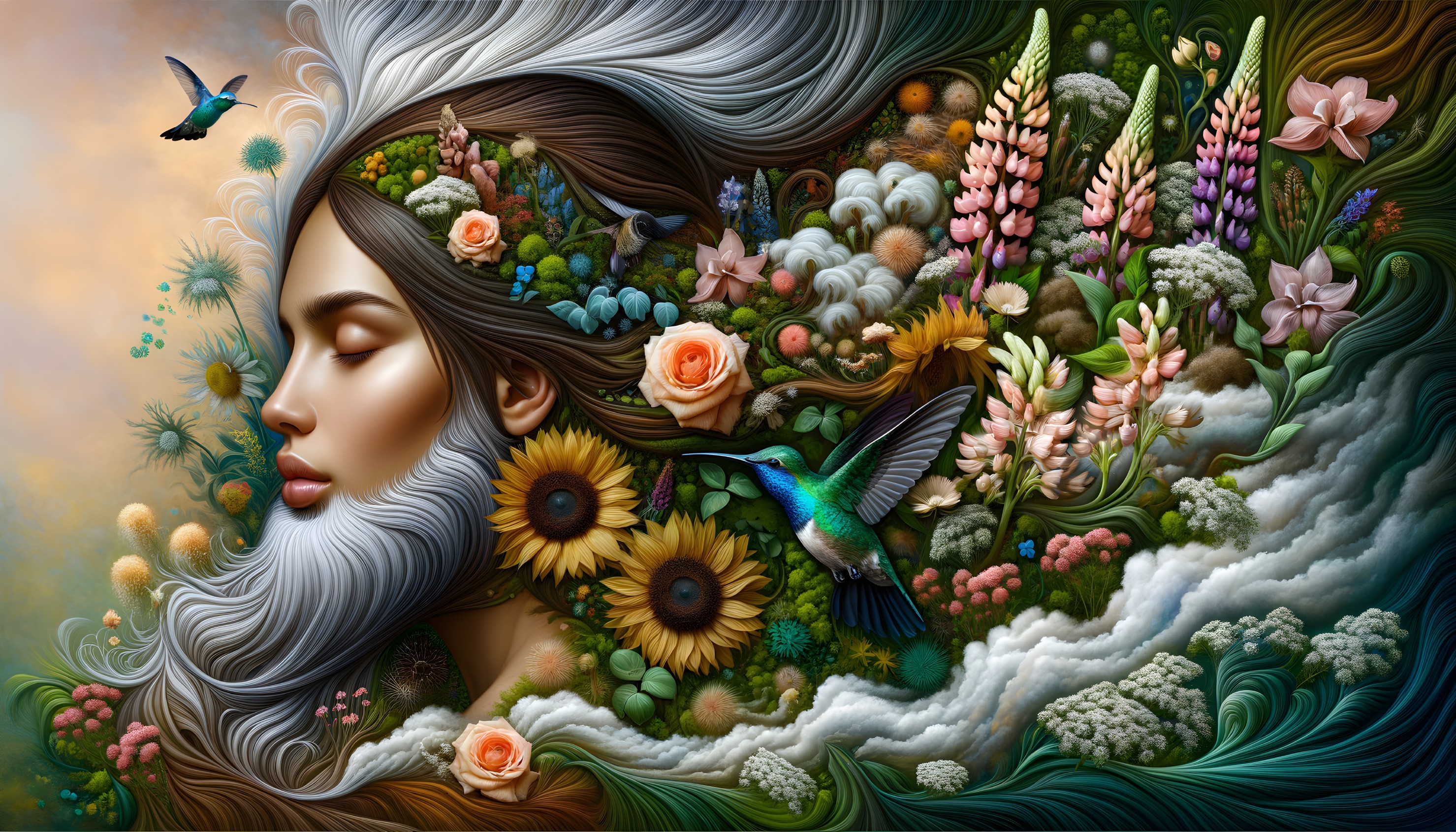 A serene woman's profile blends with vibrant flowers and hummingbirds in a colorful, nature-inspired artwork.