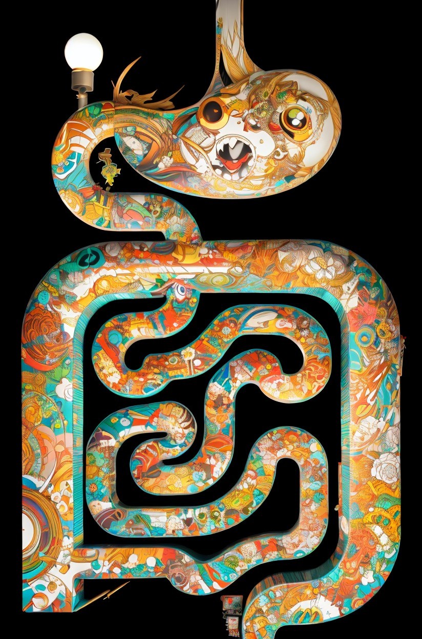 Intricate Maze-Like Artwork with Squiggle Pattern and Pop Culture Stickers