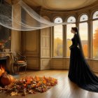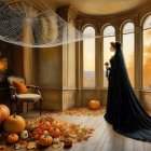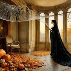 Prompt: "FIRST AUTUMN lights in the old interior, spider web veil, in the style of Wolfe Von Lenkiewicz ,style klimt e Van Gogh