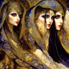 Two enchanting women with dark, flowing hair wear intricate black veils adorned with golden patterns. They gaze into the distance, set against a twilight sky and a detailed architectural background.