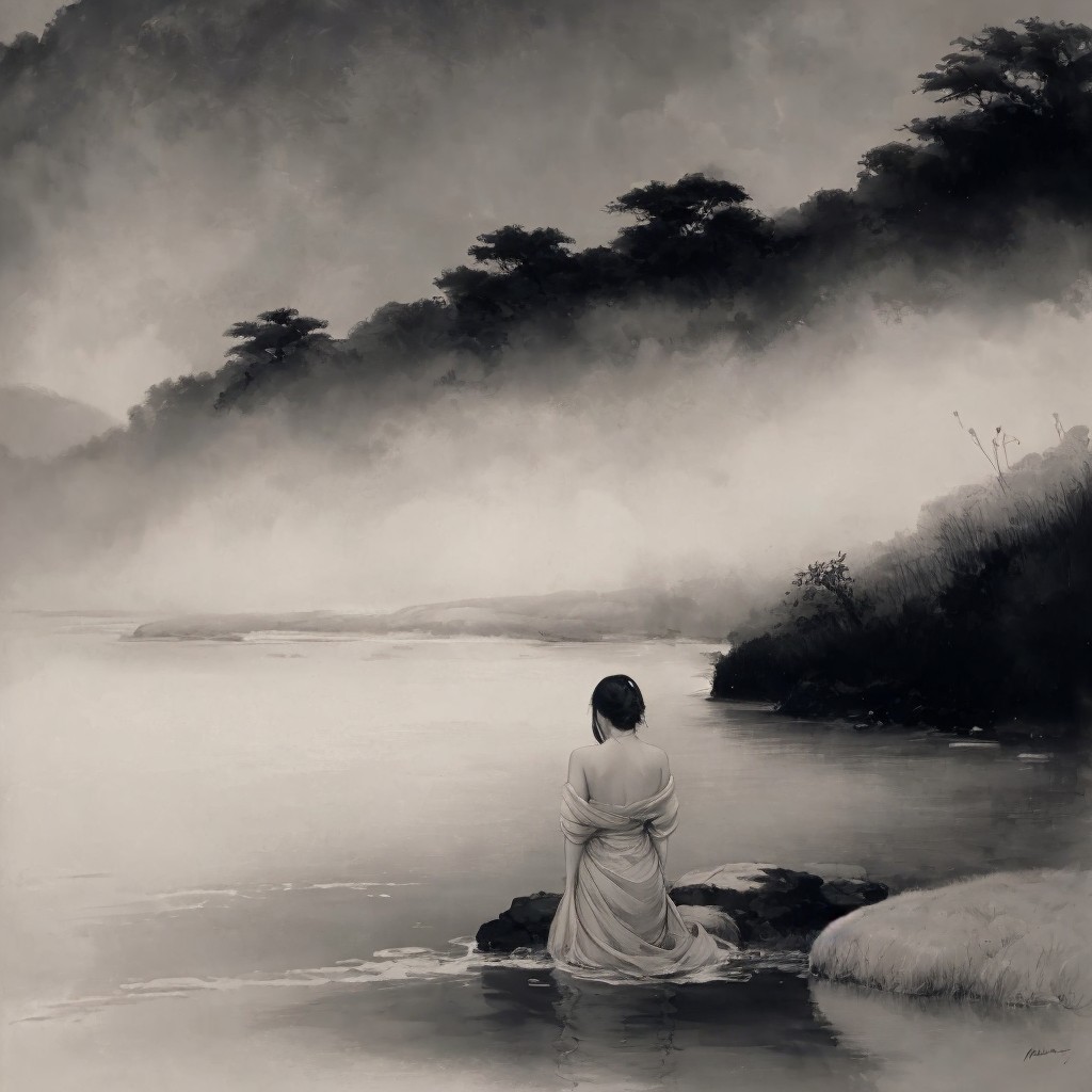 Prompt: "An intimate portrait of a woman bathing in a stream; seen from the back, she is described with soft sensual curves in the elegant simplicity of Sumi-e brush style; meticulous freehand brushwork in ink, the focus is on atmosphere and mood, with a quiet eroticism; combining the elegant composition and detail of Ohara Koson and the soft atmosphere of Mori Sosen"
