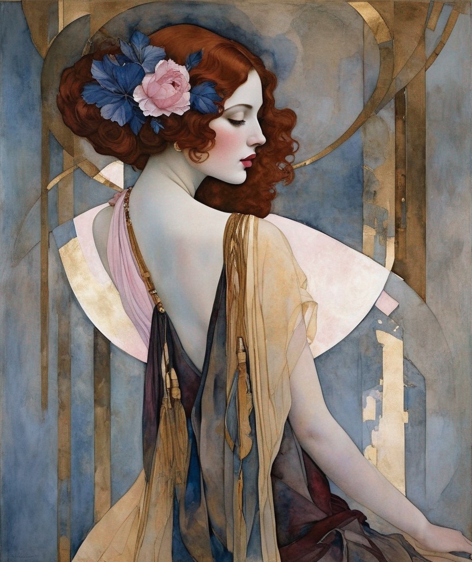 whimsical, beautiful, poignant, touching. colors pink, gold, rust, indigo, burgundy, black. soft watercolor extra water in Art Deco by Annigoni, Egon Schiele, Milo Manara, Botticelli, Catrin Welz-Stein, Jean Metzinger, Klimt, perfect eyes, perfect hands face , highly detailed, complementary colors, hyper detailed. Watercolor and ink splatter, dynamic pose,
