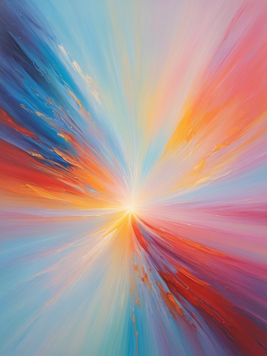 A vibrant abstract painting featuring swirling clouds of blue, orange, and pink, radiating from a bright central light, creating a dynamic sense of energy and movement.