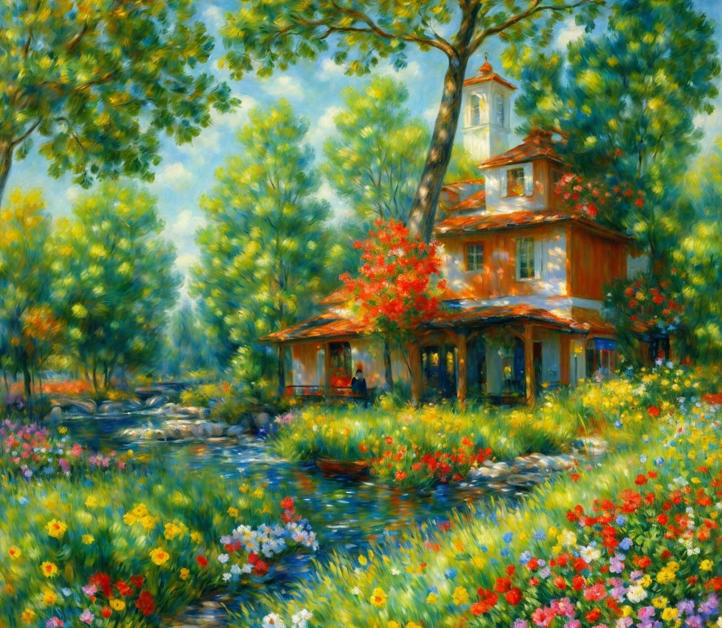 A vibrant painting of a cozy orange house surrounded by lush trees and colorful flowers with a river nearby.