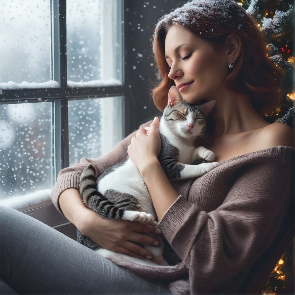 + Prompt:create a sleeping red haired middle aged woman with chin length hair, sitting on a chair, in front of a window, holding her beloved gray and white tabby Oriental shorthair cat, also sleeping, in her arms. Serene peaceful calm. the snow falling outside. Xmas lights shinning in background