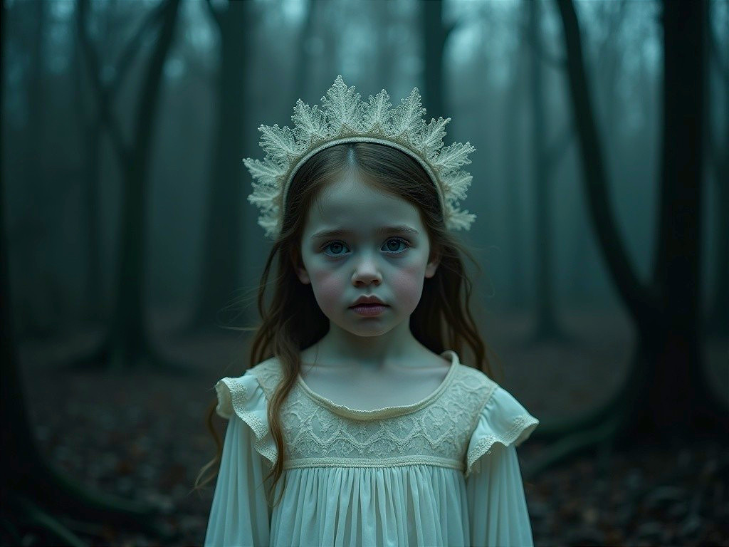 A solemn girl in a delicate, white gown stands in a misty forest. She wears a floral crown, her gaze piercing and ethereal, surrounded by dark, shadowy trees in a dreamlike atmosphere.