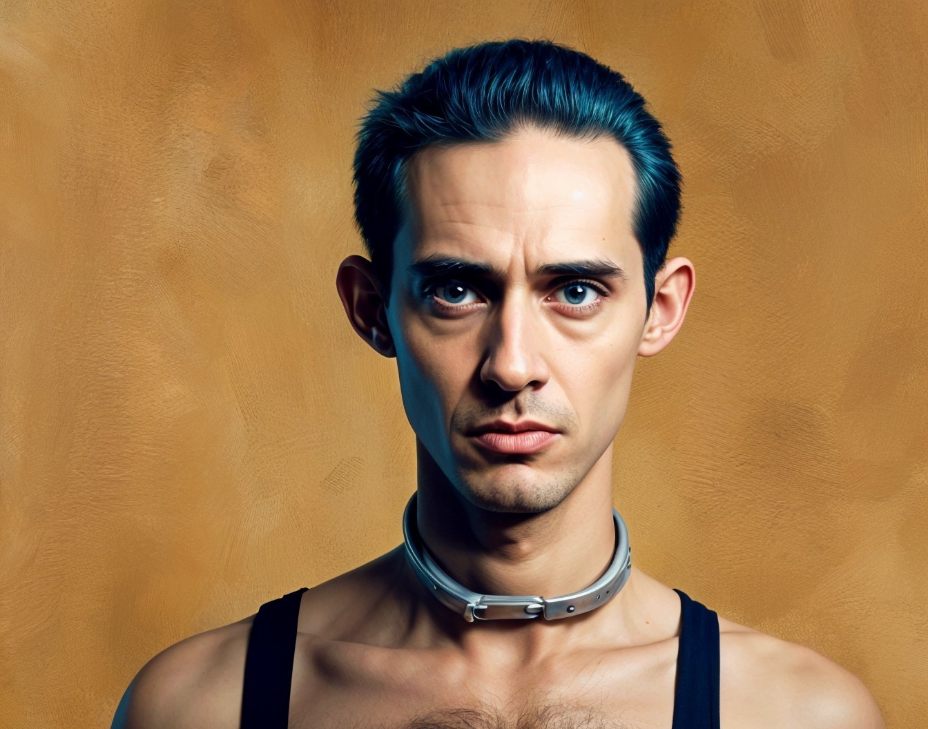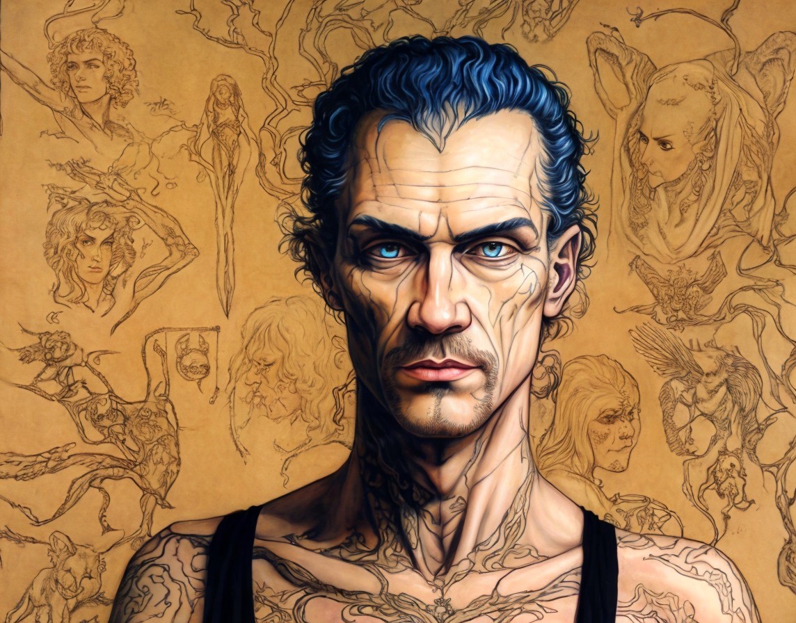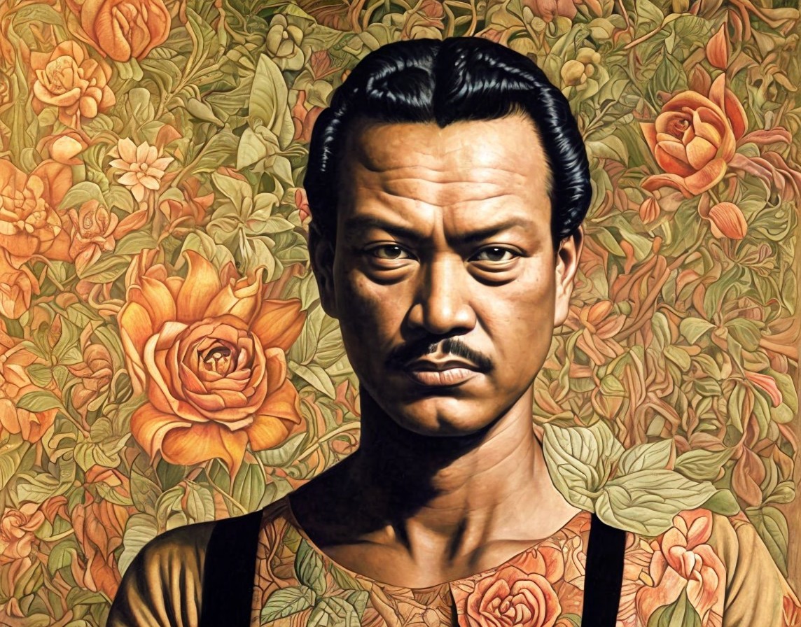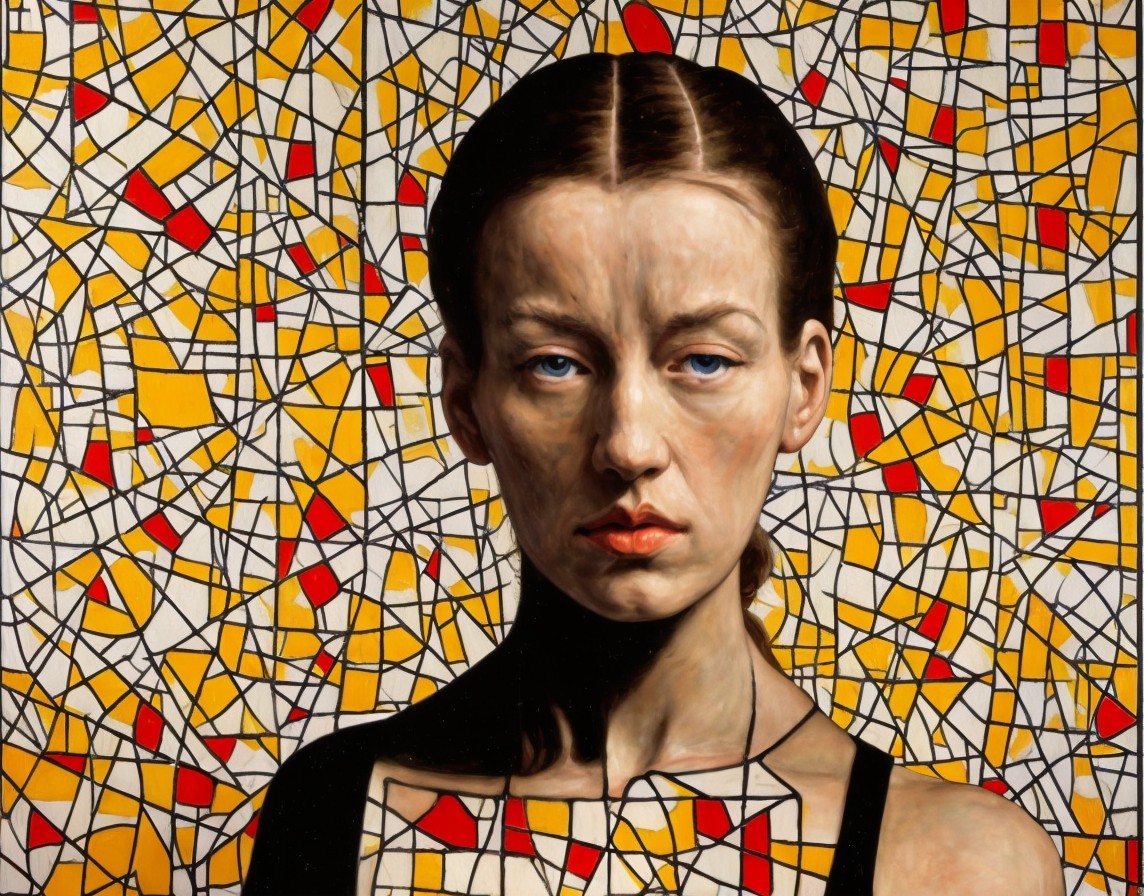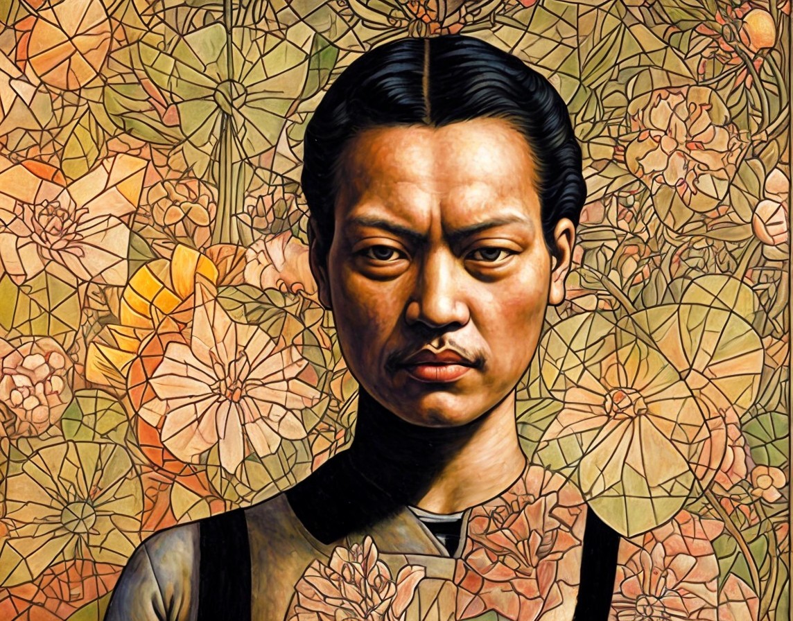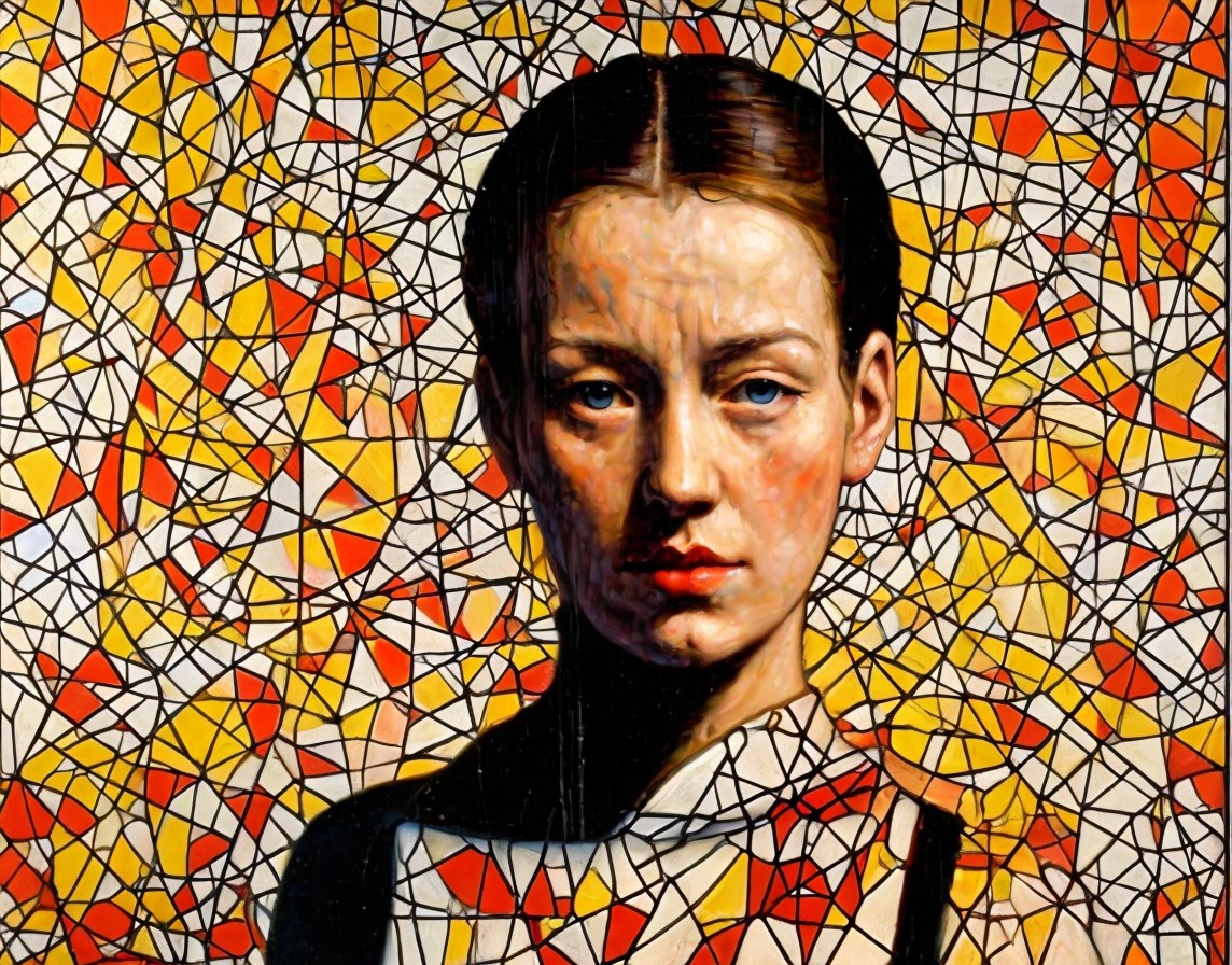 A painting of a woman with a solemn expression against a vibrant, geometrically-patterned backdrop.