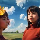 Two striking women stand against a skyline backdrop. One has vibrant orange hair, while the other features sleek black hair. They both wear form-fitting red outfits, exuding a futuristic vibe.