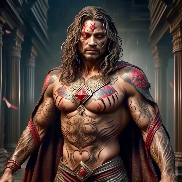 A detailed statue of a bearded warrior with intricate armor and a green cloak against an ornate building facade.