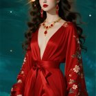 A striking figure in a deep red gown, featuring a plunging neckline and intricate embroidery. She exudes elegance, with flowing hair and ornate earrings, set against a striking blue backdrop.