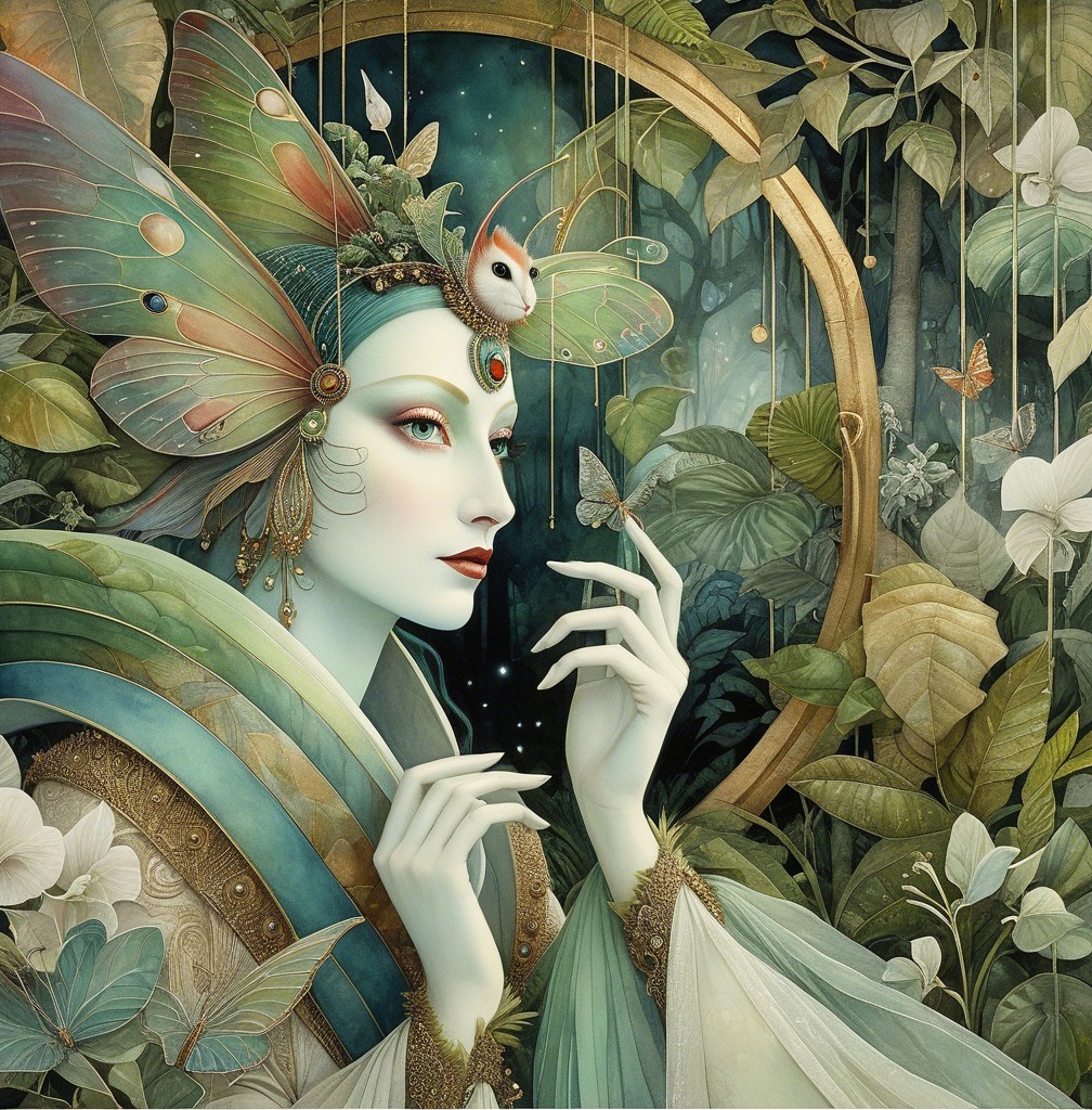 Close up, ghostly amused beautiful Amazonian Luna moth goddess in a jungle dreamscape in the style of Alexander Jansson. by Catrin Welz-Stein, Michael Parkes