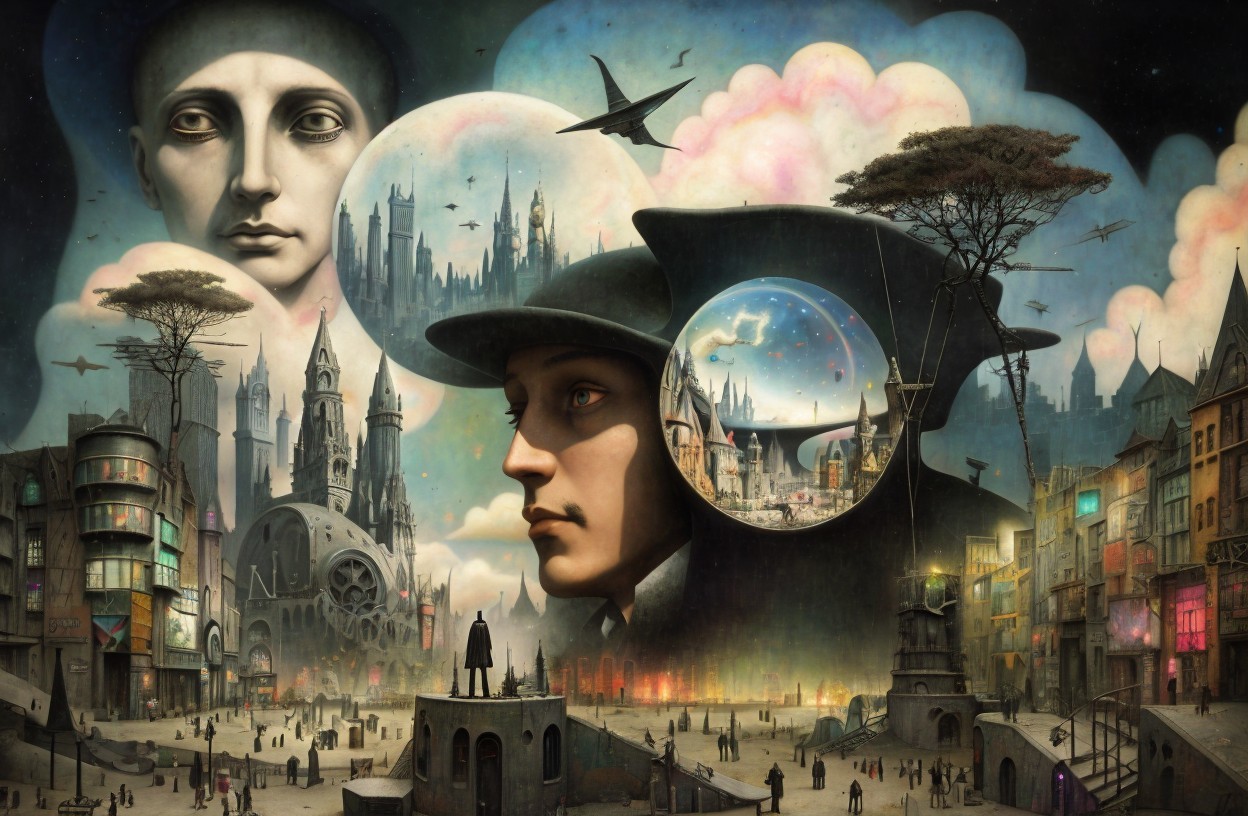 + Prompt:Weird wizard, in Modern city, Dystopian statues, cosmic colorful background, dof, oversized brain. Mixed media. By Alfred Kubin and Paul Klee. Black hole in the sky, bridges to the city, psychedelic cloud colors, Comics style mixed with dystopian miniature work. cybernetic realisim,