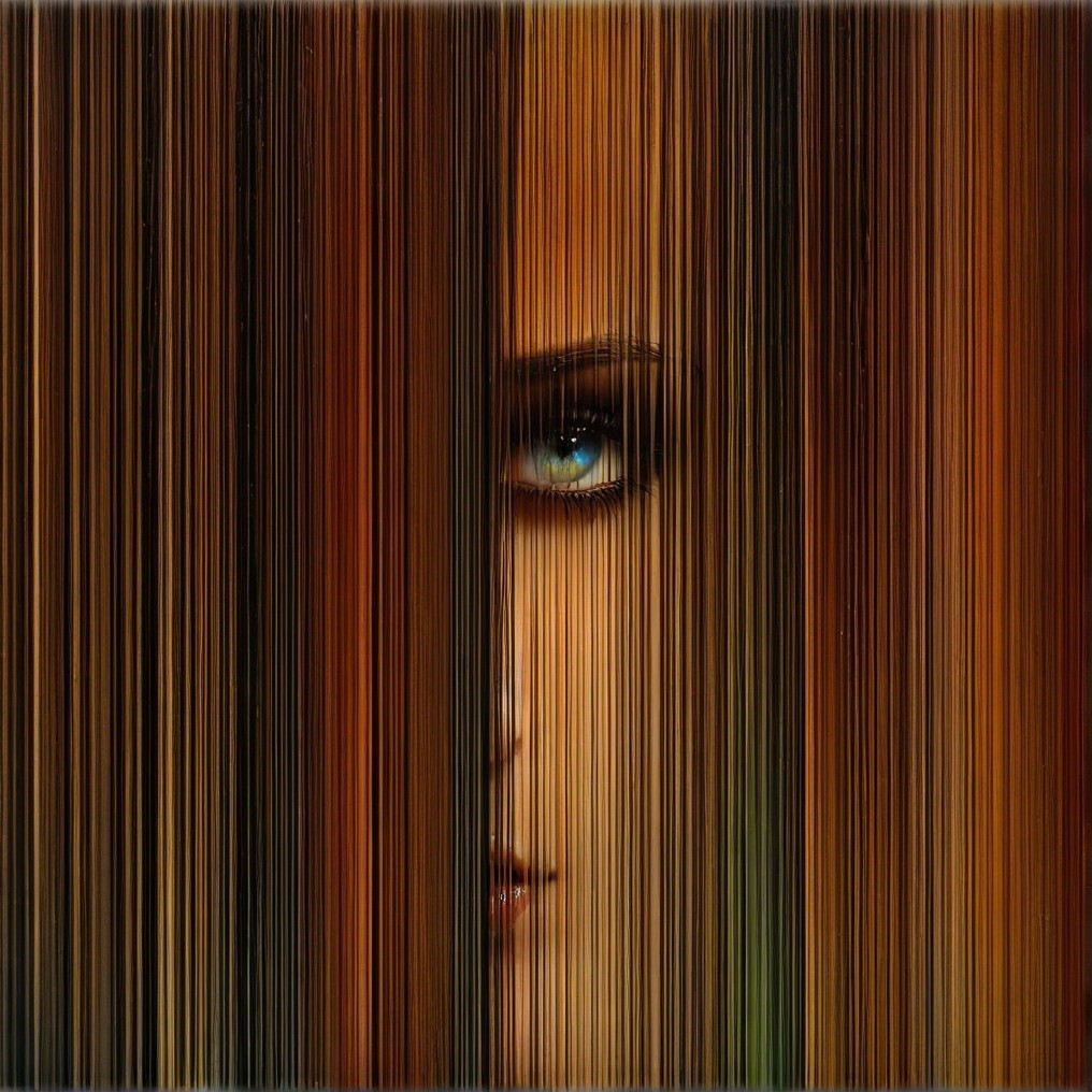 The image features a close-up of a woman's face partially obscured by vertical lines, creating a striking visual effect. Her piercing green eye and sleek features draw the viewer's attention. Original Prompt: Lexi
