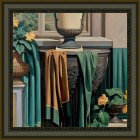 Two women and a child are seen on a balcony overlooking a snowy town, viewed through an ornate wooden frame. The woman on the left has long blonde hair, adorned with a wreath, and is wearing a flowing light blue gown with golden embroidery. She gazes downwards, her left hand resting on the